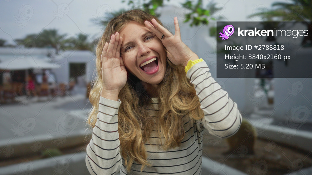 Woman raises hands while laughing in outdoor setting with blonde hair framing a joyful expression as covering eyes in a playful portrait during a vacation. - Kraken Images