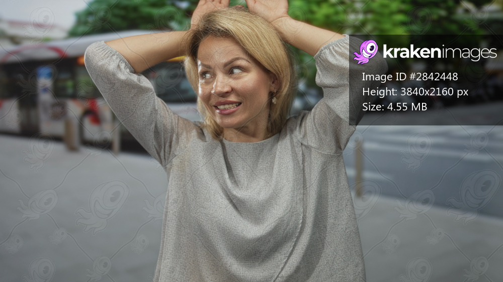 Woman raises her hands behind her head in playful bunny ears gesture on urban street near bus stop; playfulness.