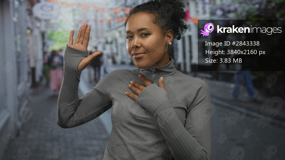 Woman raises left hand and places right hand on chest on a narrow city street lined with shops and storefronts; sincerity.
