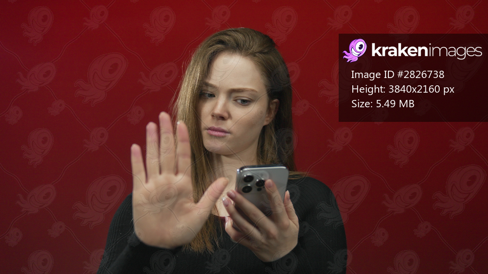 Woman raises palm and holds smartphone against red wall in studio with serious expression; rejection privacy.