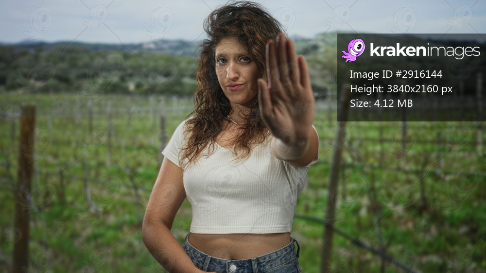 Woman raises palm to camera in forest showing stop gesture and stern expression, cropped midriff visible; defiance protection.