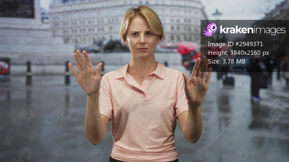 Woman raises palms and crosses hands near her face on a wet street with red buses and stone building, blocking view and signaling stop; defiance.