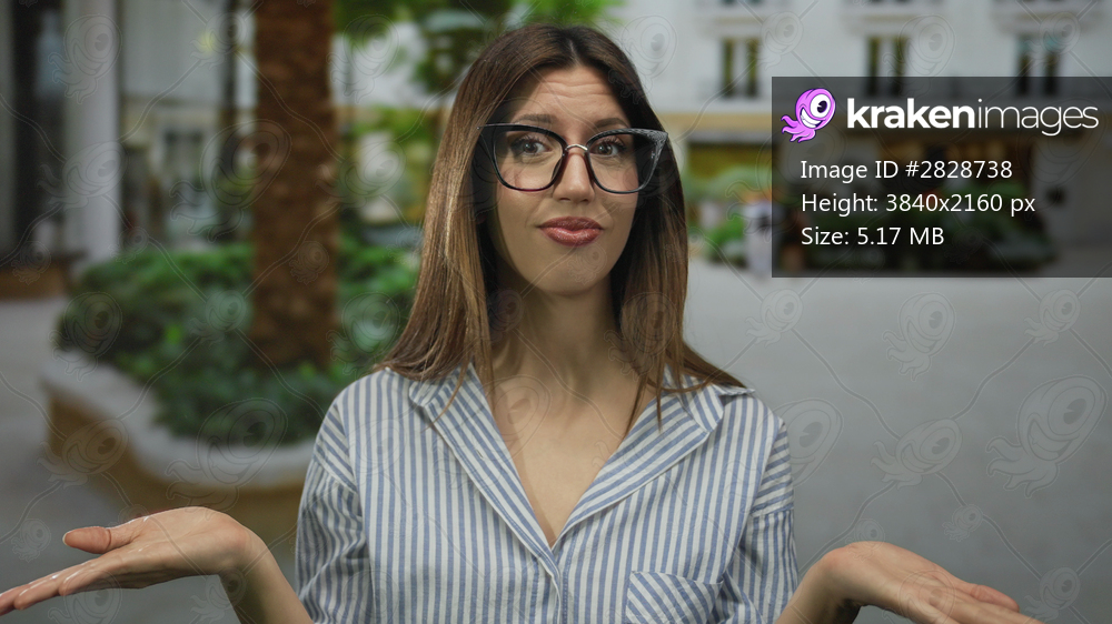Woman raises palms to sides on busy city street wearing striped shirt and glasses amid blurred building facade; confusion.