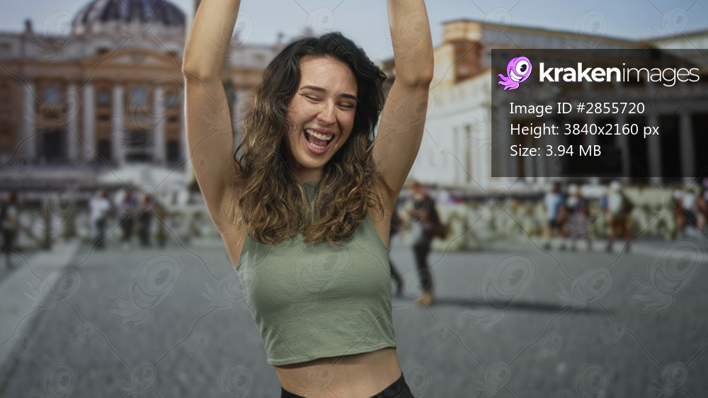 Woman raising arms in green top on crowded street at vatican with laughing smile under sunlight; joy celebration excitement.