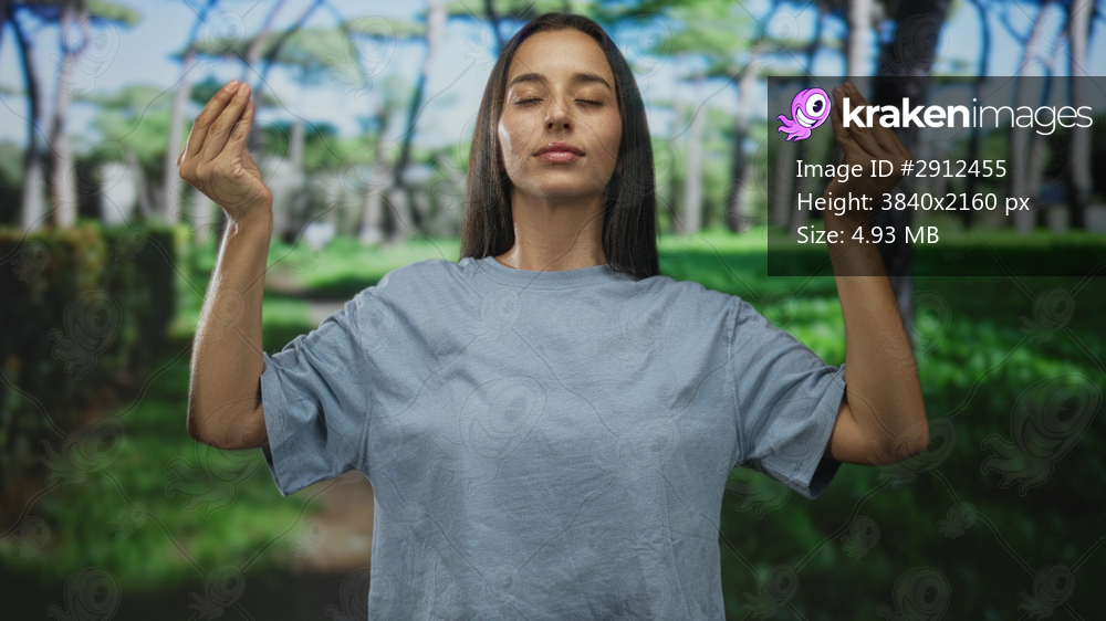 Woman raising arms with open palms and closed eyes in forest among green trees, wearing blue tee; breath mindfulness calm.