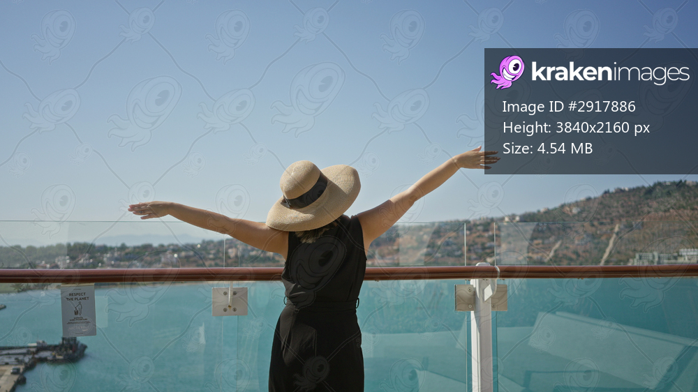 Woman raising arms overhead beside glass railing on cruise ship deck building under clear sky, wearing sunhat and black jumpsuit; serenity.