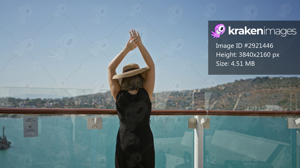 Woman raising arms overhead beside glass railing on cruise ship deck building under clear sky, wearing sunhat and black jumpsuit; serenity.