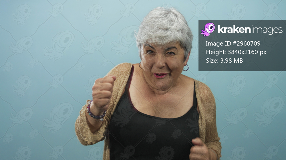 Woman raising arms and smiling with exposed shoulders and hoop earrings against a blue studio backdrop, wearing a cardigan and tanktop; joy celebration. - Kraken Images