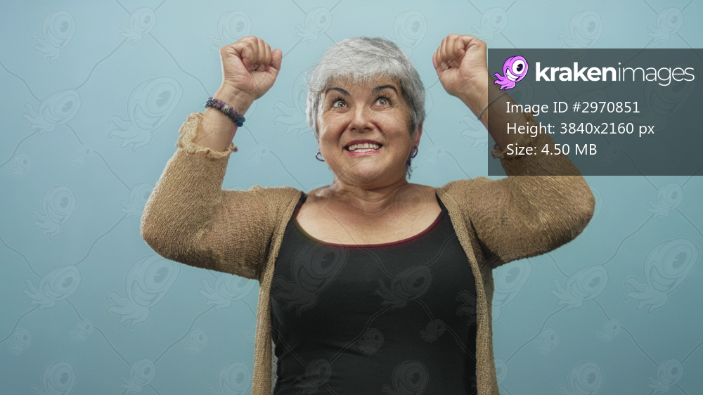 Woman raising arms and smiling with exposed shoulders and hoop earrings against a blue studio backdrop, wearing a cardigan and tanktop; joy celebration. - Kraken Images