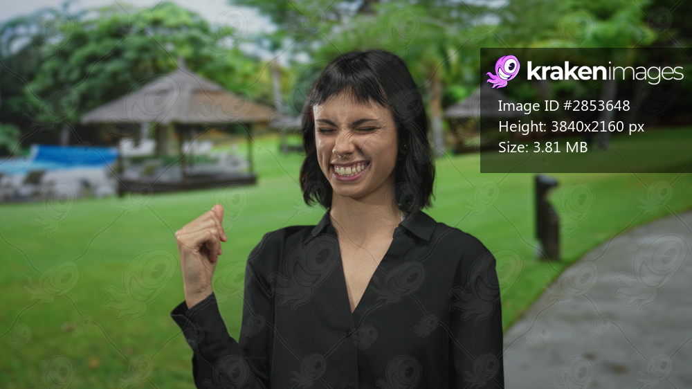 Woman raising bare hand with pointing finger and smiling face toward camera in natural forest; confidence.