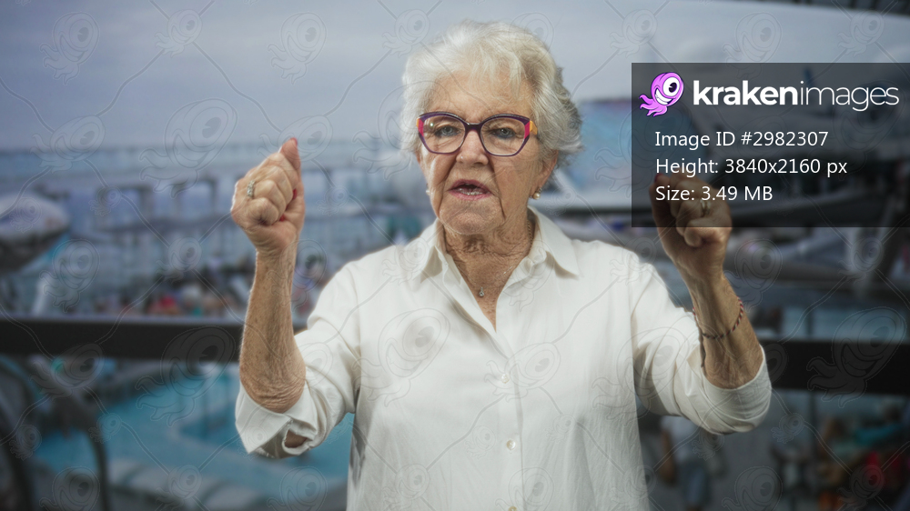Woman raising both fists and hands, wearing glasses and white shirt, in a studio with cruise ship and pool imagery; joy celebration.