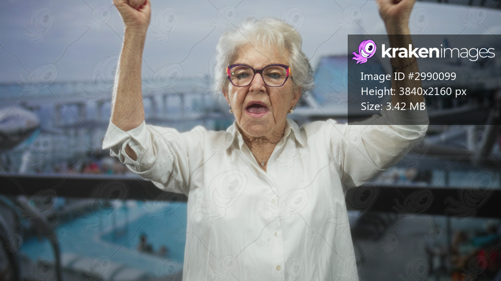 Woman raising both fists and hands, wearing glasses and white shirt, in a studio with cruise ship and pool imagery; joy celebration.