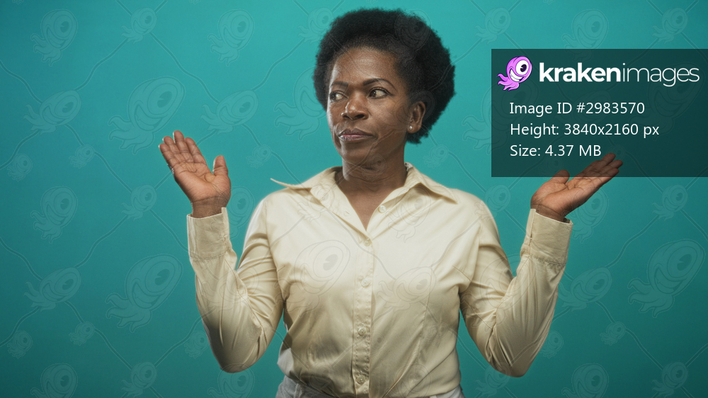 Woman raising both hands palms up in a shrug gesture wearing a cream shirt against a teal studio backdrop; resignation uncertainty.