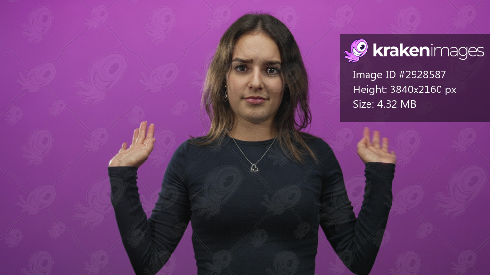 Woman raising both hands with palms visible and slight shoulder shrug against a vivid purple studio wall; uncertain doubt.