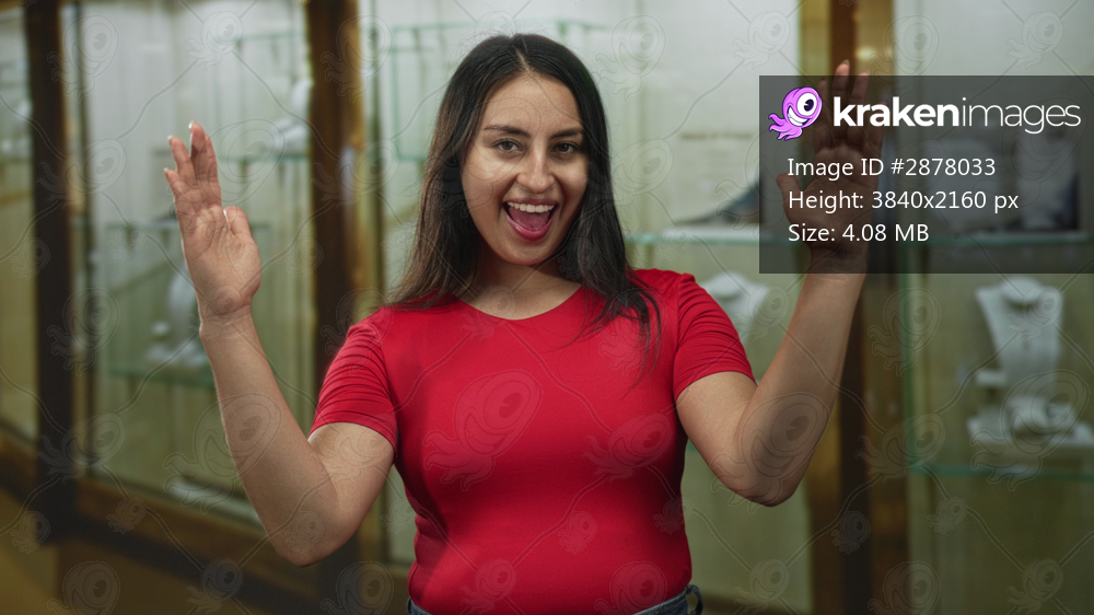 Woman raising both hands with visible palms in a red shirt inside a jewelry shop showcase with glass display cases; joy.