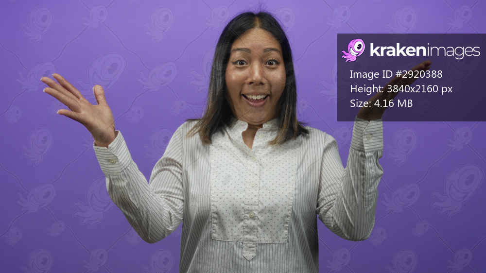 Woman raising both hands with visible palms and touching head while smiling in a purple studio wearing a striped shirt and rings; playful surprise.