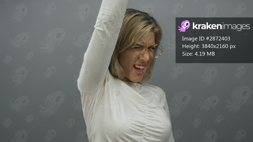 Woman raising clenched fist and smiling in grey studio with large round glasses and confident stance; empowerment.