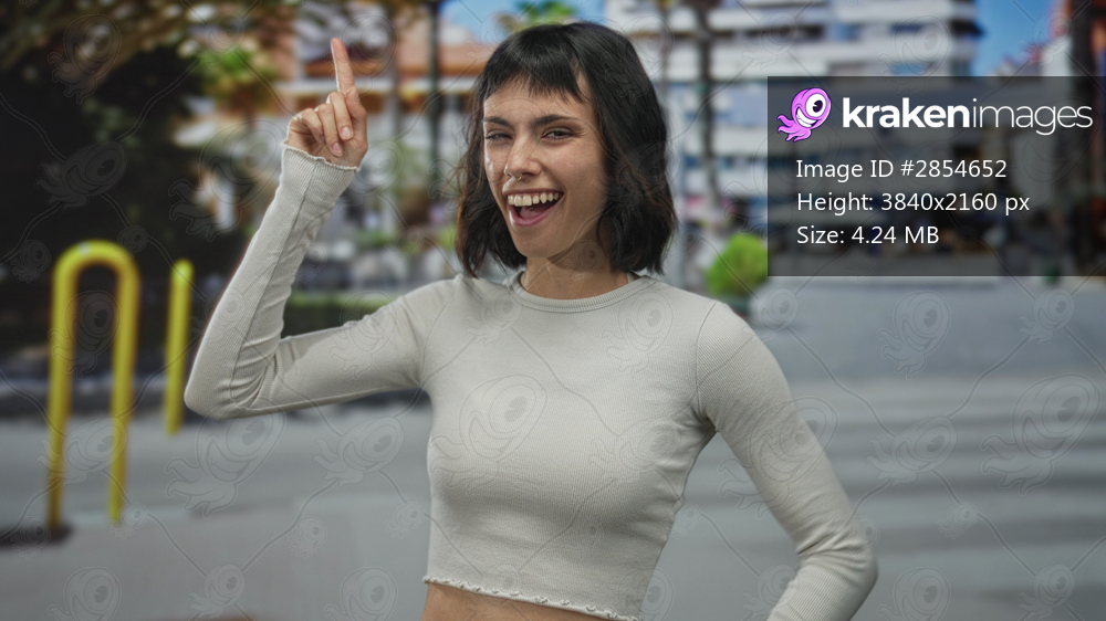 Woman raising finger to sky in bustling urban street scene near modern storefronts and sidewalk cafe; pure joy.