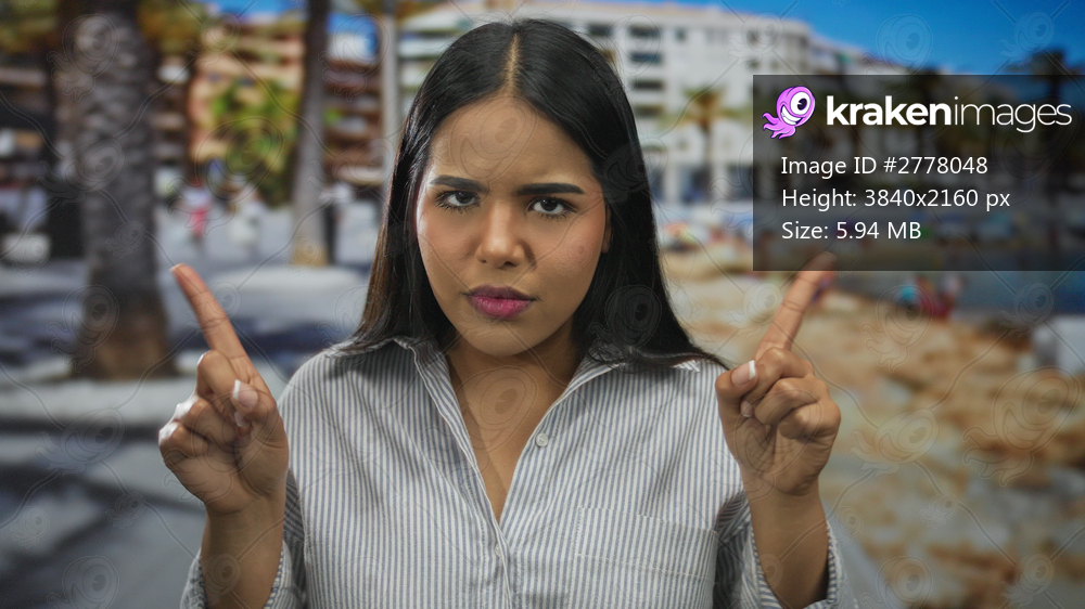 Woman raising fingers pointing at camera on a beach shows young latin hispanic attitude on a promenade by the seaside outdoors.