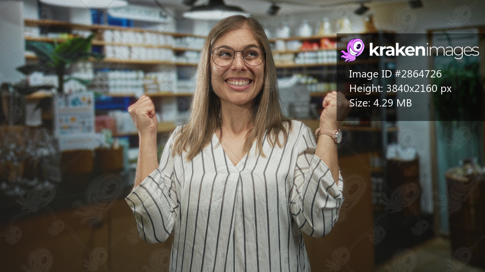Woman raising fists amid pharmacy shelves inside a modern pharmacy building; joy celebration surprise delight.