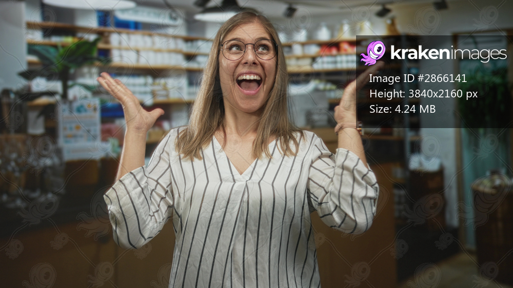 Woman raising fists amid pharmacy shelves inside a modern pharmacy building; joy celebration surprise delight.