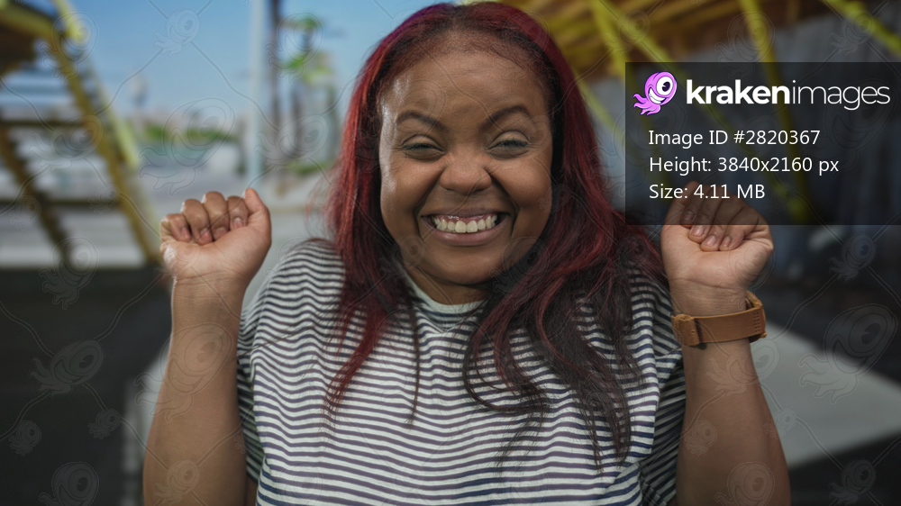 Woman raising fists in excitement on a sunny urban street with metal stairs and pavement in bright daylight; joy.