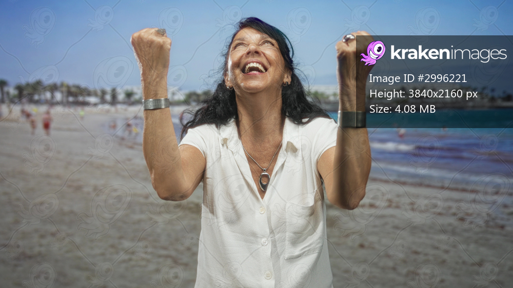Woman raising fists with silver bracelets on a sunny sandy beach, smiling broadly in a white button shirt; joy celebration.