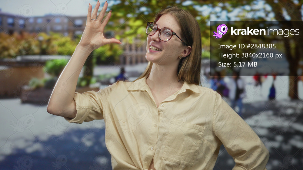 Woman raising hand and showing palm while smiling and wearing glasses in a green park with sunlight filtering through tree foliage; friendly greeting.