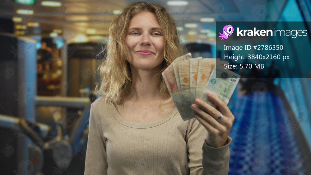 Woman raising hand and smiling at an airport walkway with a blonde young tone before brandishing banknotes and cash for travel through a busy terminal. - Kraken Images