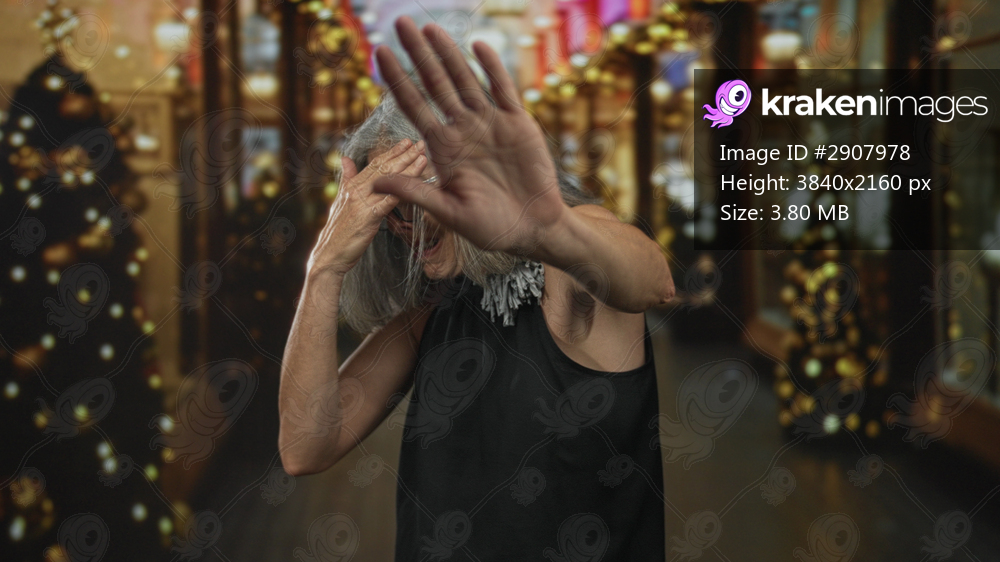 Woman raising hand to block camera and shielding face in shopping building corridor; privacy anxiety.