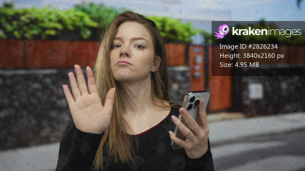 Woman raising hand to stop while glancing down at smartphone at street entrance on sidewalk during daytime; defiance.