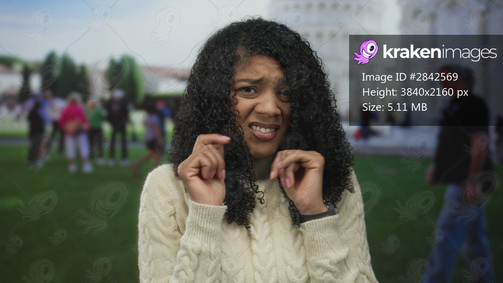 Woman raising hands by face at pisa tower landmark building in public square with blurred tourists; disgust.