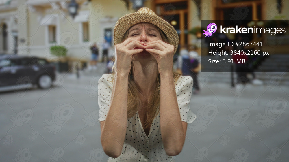 Woman raising hands and gesturing palms forward on a busy street in front of building entrance; frustration appeal.