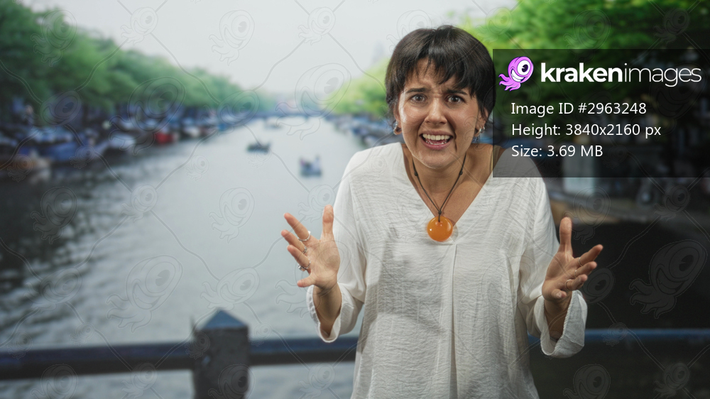 Woman raising hands in an exasperated gesturing pose on a street bridge by a canal, wearing a white blouse and amber pendant necklace; frustration.