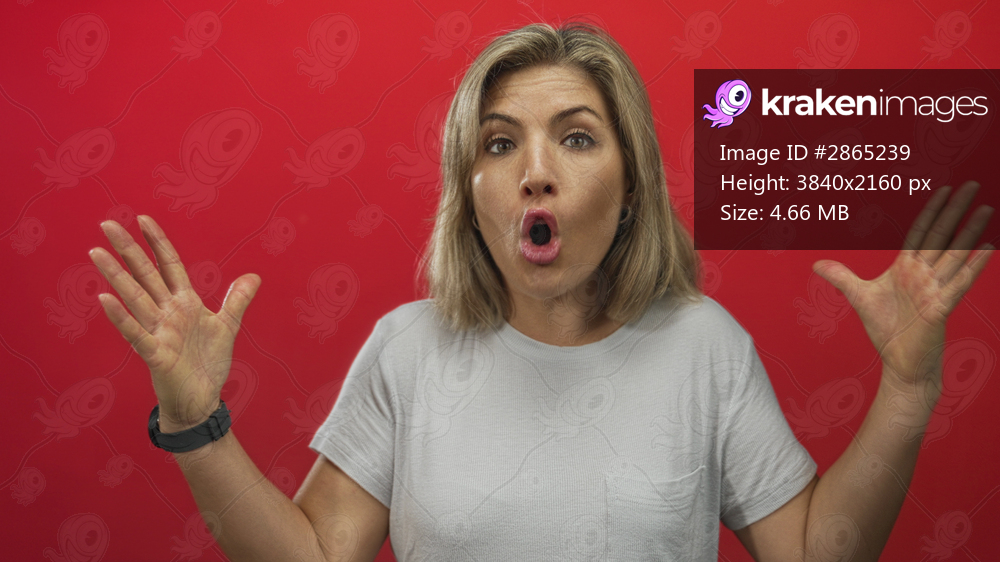 Woman raising hands with open palms and looking sideways in red studio; frustration intensity vigor expression.