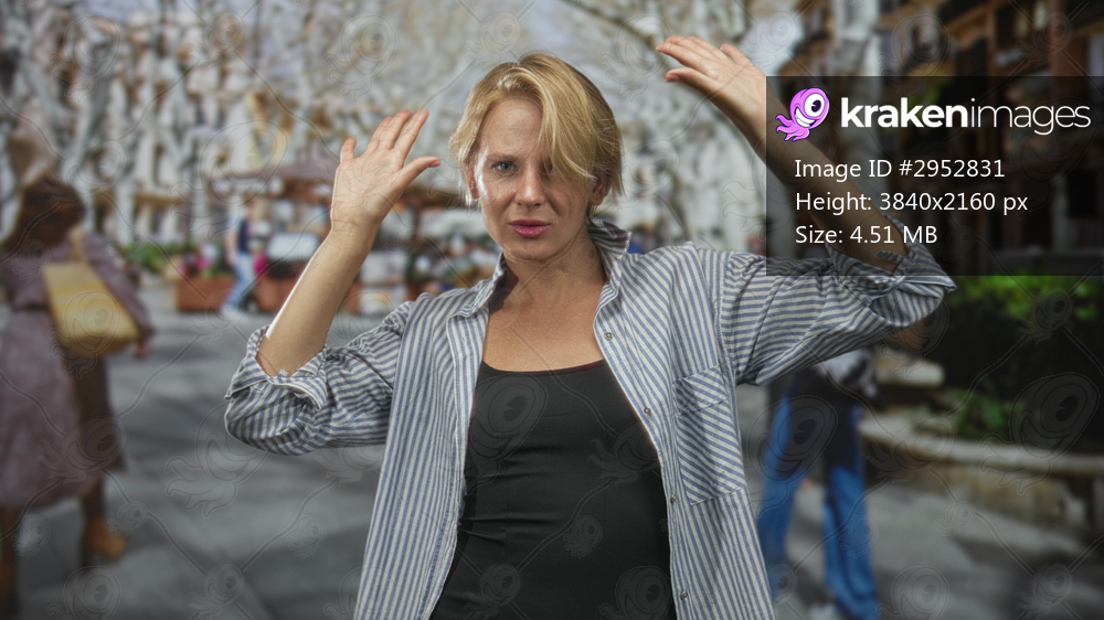Woman raising hands with palms visible and fingers spread, wearing striped shirt and black top, dancing on pedestrian street; playful joy.