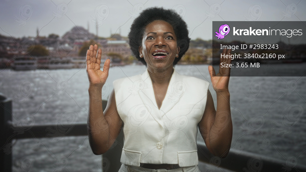 Woman raising hands with palms visible wearing white vest on street waterfront by city skyline and mosque; joy.