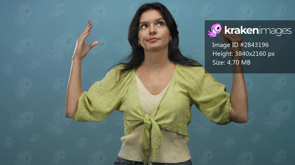 Woman raising hands with red nails and expressive gesture in green blouse in studio against blue wall; frustration.