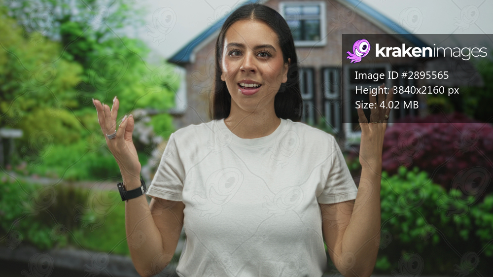 Woman raising hands and rubbing eyes outside a building entrance in a white tshirt and watch; surprise curiosity.