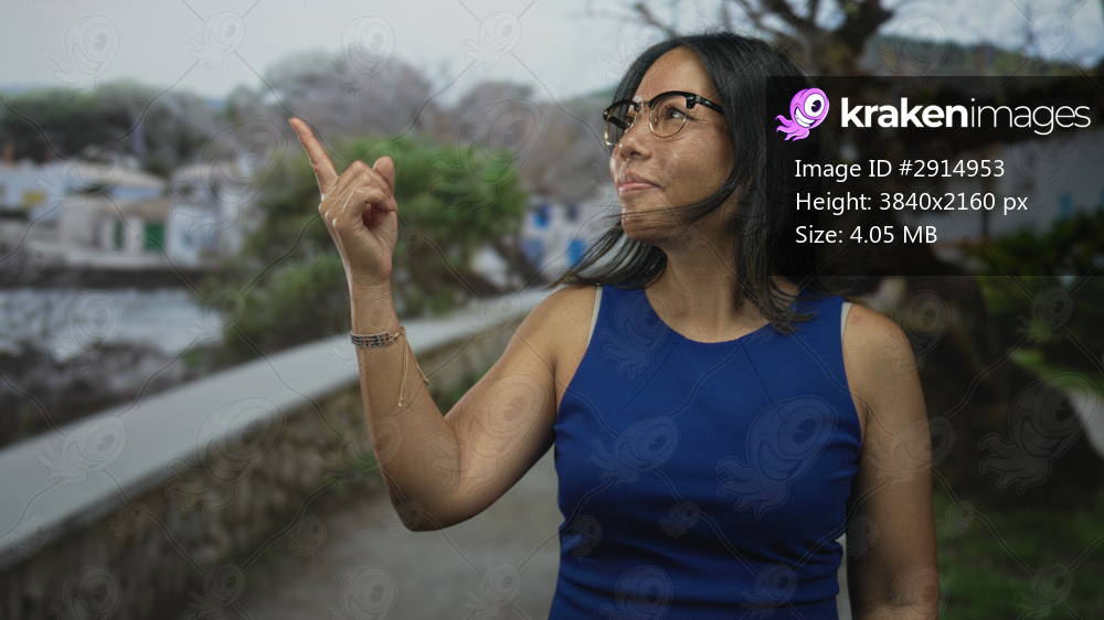 Woman raising hands showing bare arms on street promenade by the seaside; serenity reflection travel memory.