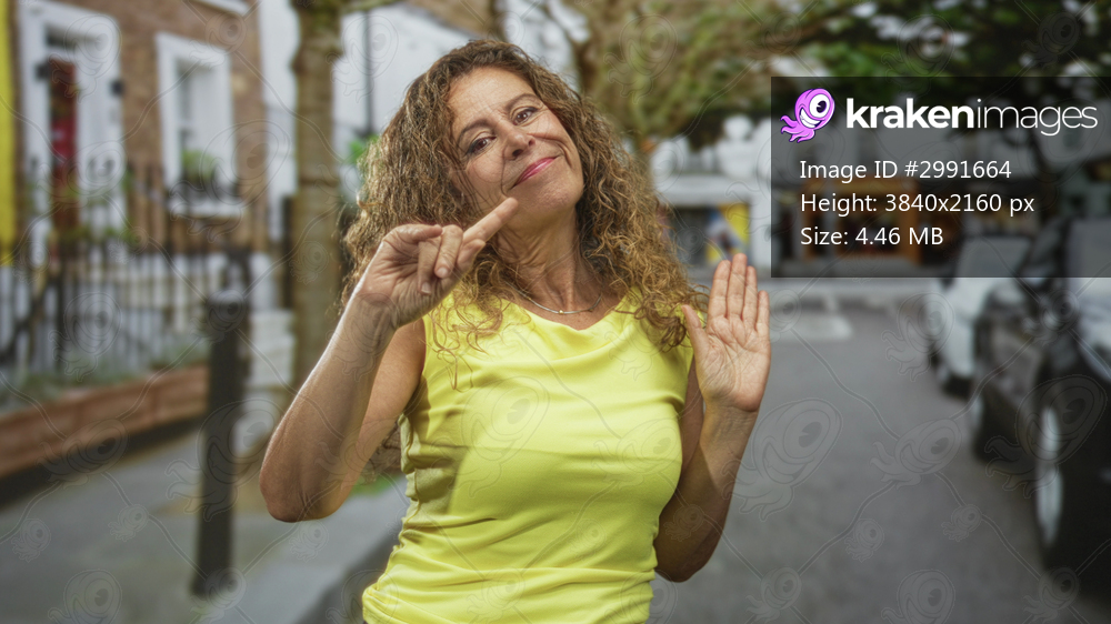 Woman raising hands and smiling with bare forearms visible on a city street, palms open toward camera; playful greeting.