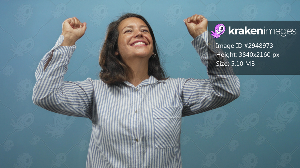 Woman raising hands and smiling, bare hands visible and striped shirt front shown in studio with plain blue backdrop; celebration joy.