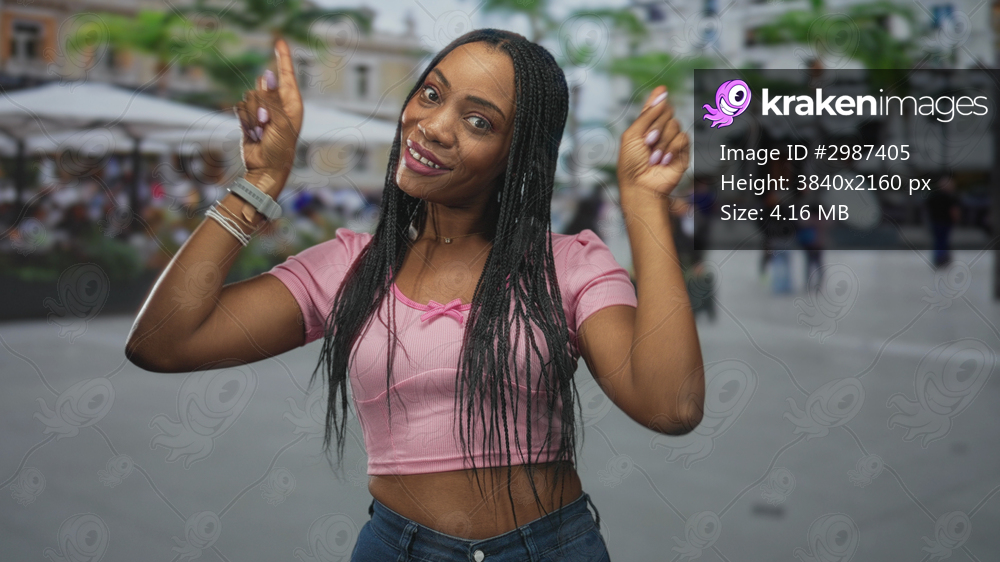 Woman raising hands and smiling on a busy street cafe, wearing pink crop top, denim jeans and bracelets, hands visible and lifted; playful energy.