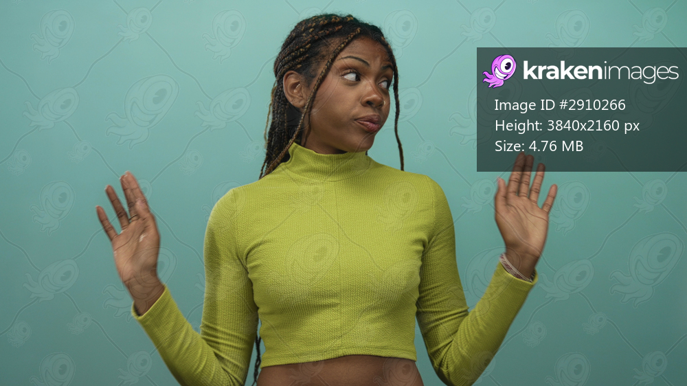 Woman raising hands with visible palms and nose piercing in teal studio wearing lime turtleneck and braids; dismissal shrug.