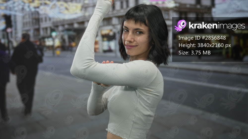 Woman raising her arm with a subtle smile in front of urban building facades on a busy street; confidence.