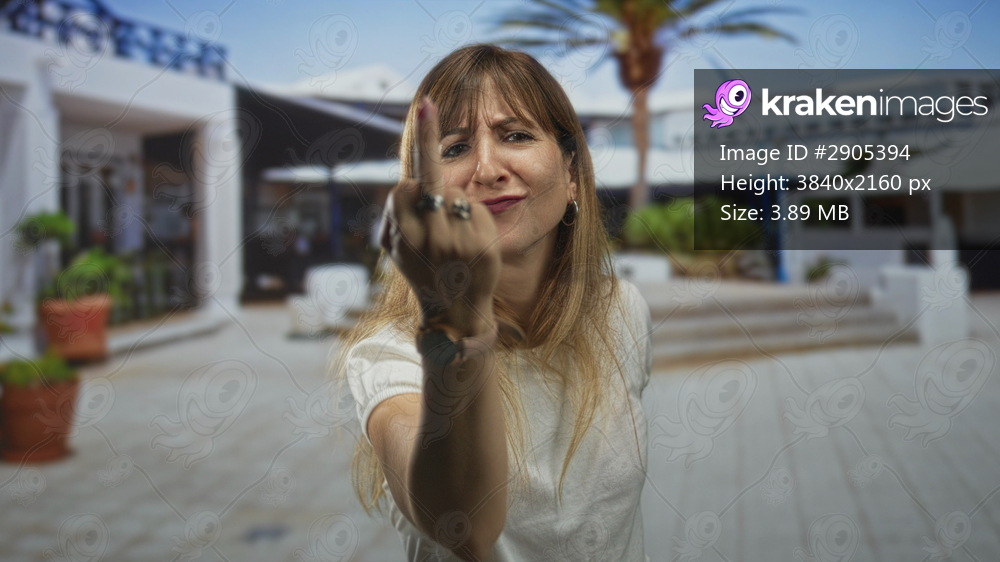 Woman raising middle finger toward camera in a sunny street plaza with palm tree and white building; defiance attitude.
