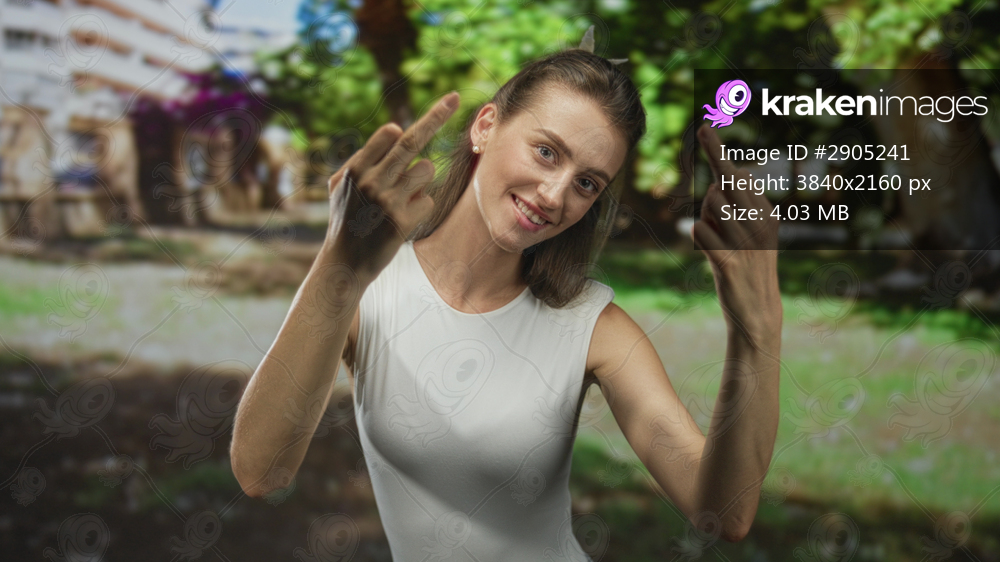 Woman raising middle fingers with bare hands in a forest park setting, smiling and looking sideways; defiance boldness attitude.