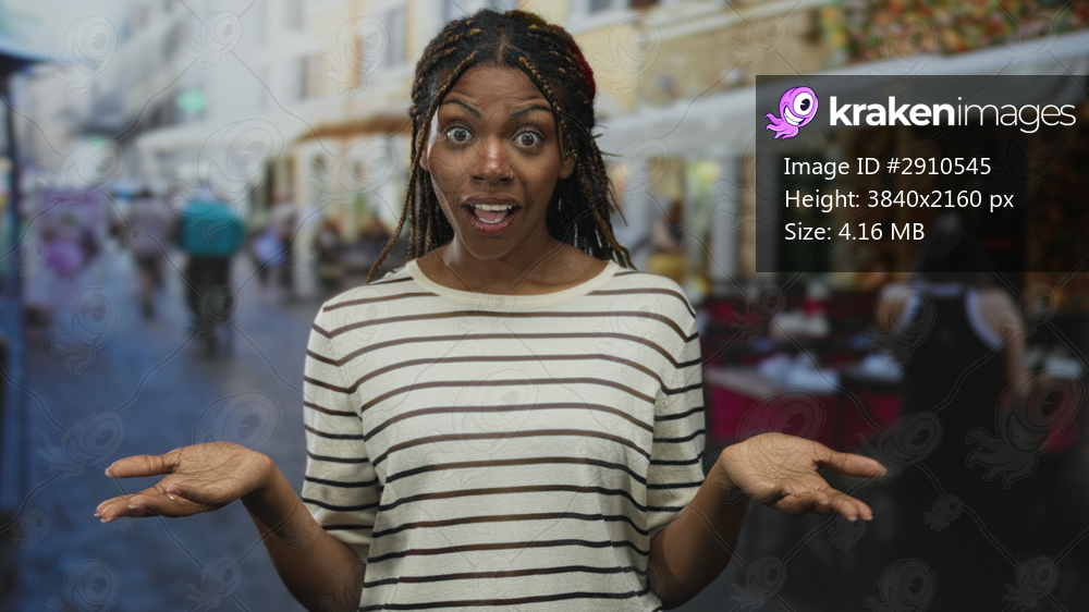 Woman raising palms in a shrug with hands to chest on street restaurant terrace showing an open gesture and striped shirt; surprise curiosity.