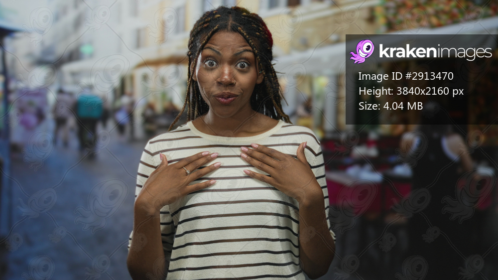 Woman raising palms in a shrug with hands to chest on street restaurant terrace showing an open gesture and striped shirt; surprise curiosity.
