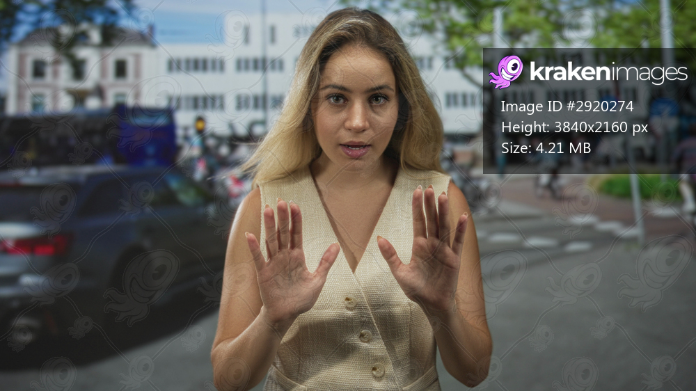 Woman raising palms out in stop gesture on a city street crosswalk near cars and bicycles while wearing a sleeveless vest; personal boundary determination. - Kraken Images